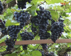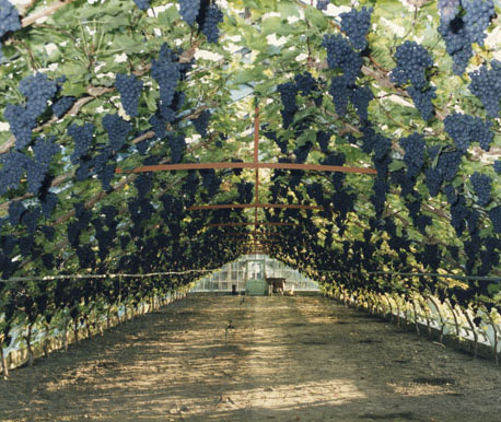 deur achter. De druivenranken worden tegen de wanden en het dak geleid met